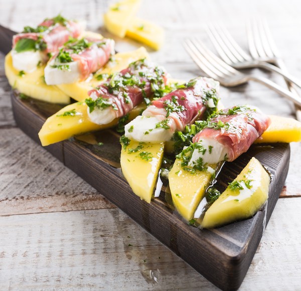 Una idea sencilla, original y rápida, además de riquísima: cortamos el mango en gajos y el queso mozzarella en trozos alargados. Enrollamos cada trozo de queso con media loncha de jamón y disponemos los rollitos encima del mango. Picamos un puñado de albahaca fresca y un diente de ajo, lo mezclamos con un buen chorreón de aceite de oliva virgen extra y rociamos los rollitos y el mango con esta salsita.