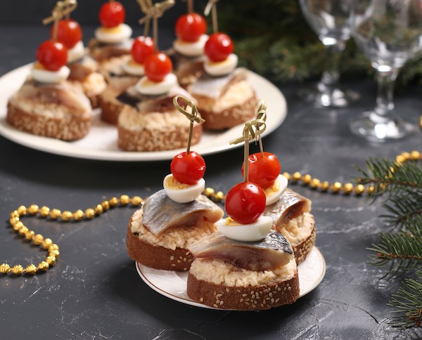 Canapés con pan de molde de arenque, huevos de codorniz y tomates cherry