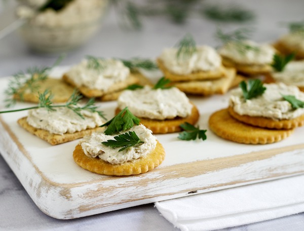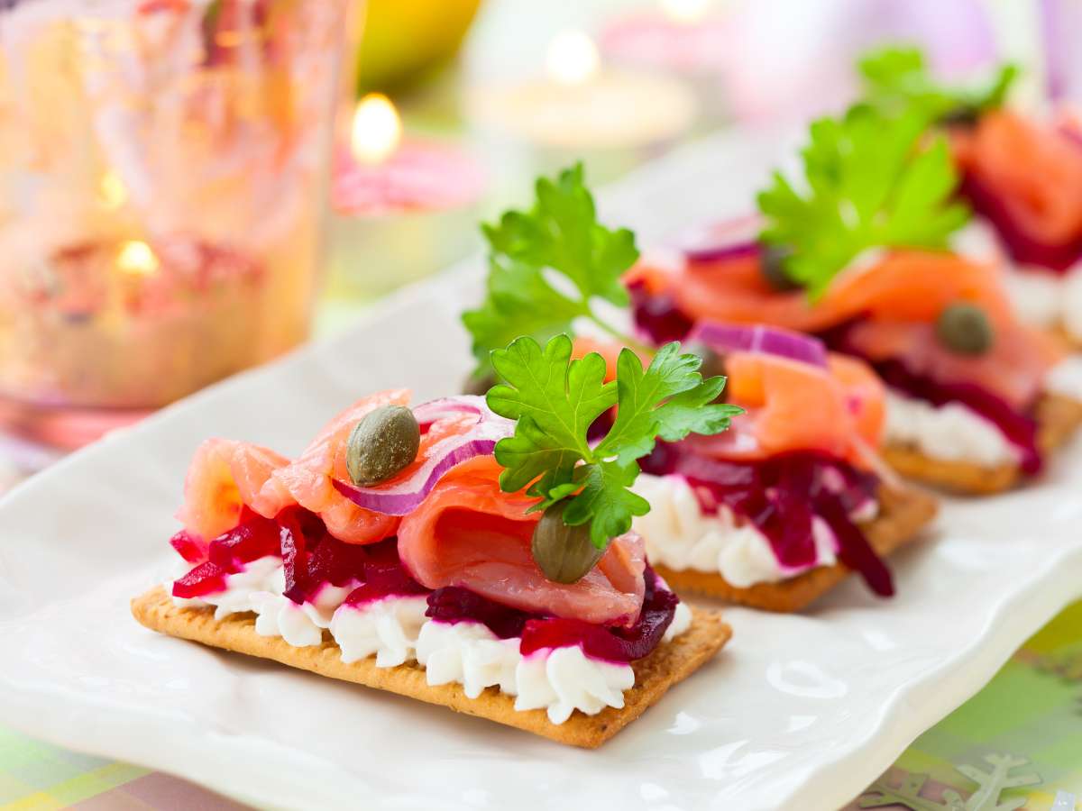 Otra opción fácil de preparar es combinar los crackers con queso crema, remolacha cocida rallada, salmón ahumado, cebolla y alcaparras.
