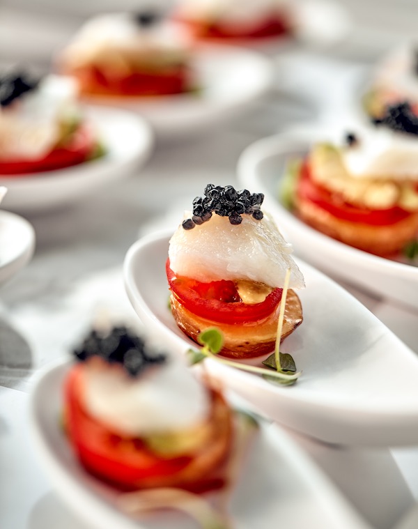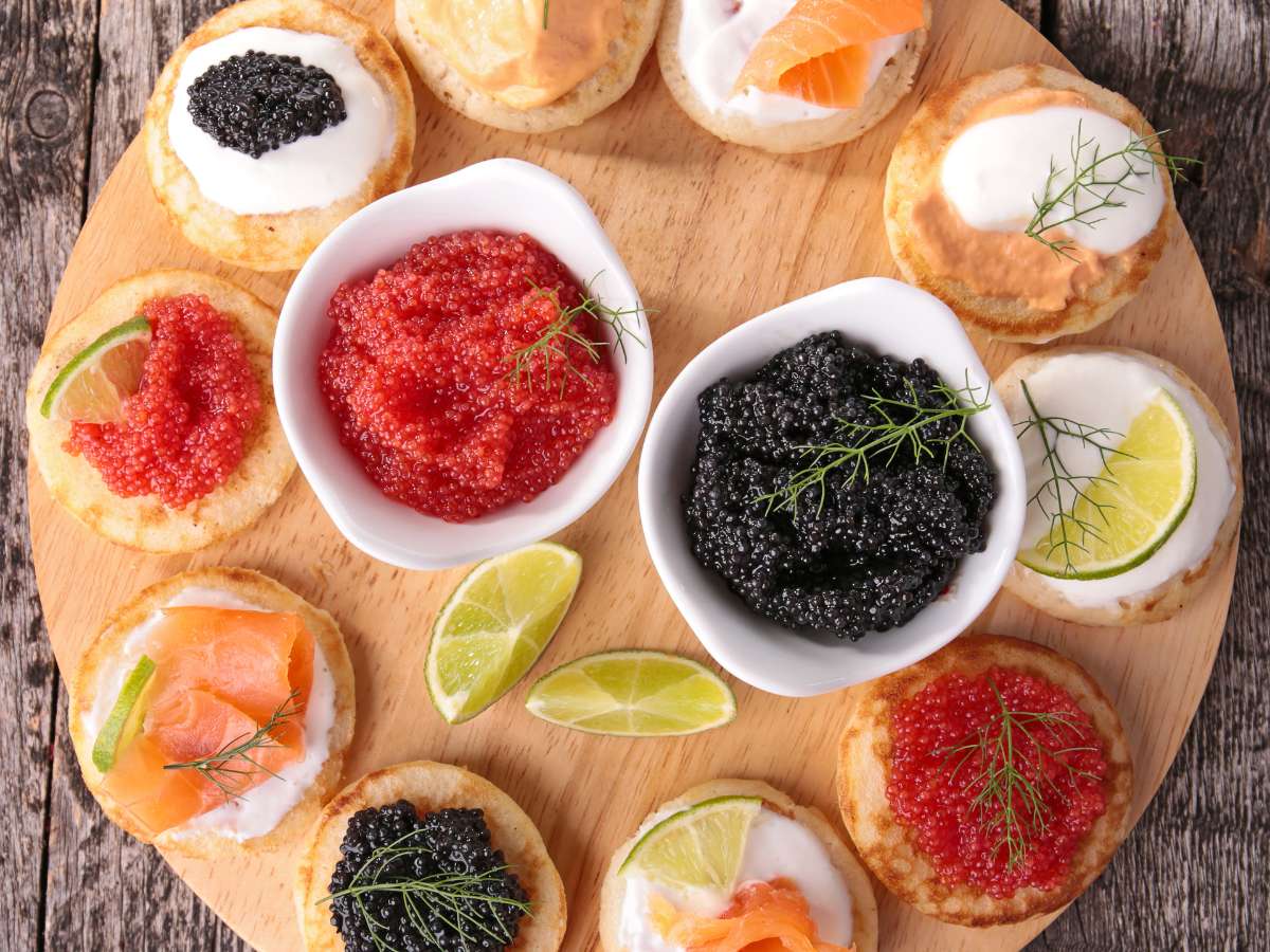 En esta selección de canapés variados tenemos por un lado canapés de pan de molde con diferentes tipos de patés, que al final se decoran con caviar rojo de salmón.