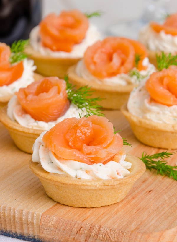 Preparación: tan sencillo como rellenar los volovanes con el paté de salmón y decorar con un rollito de salmón, una flor comestible y algunas huevas de pescado.