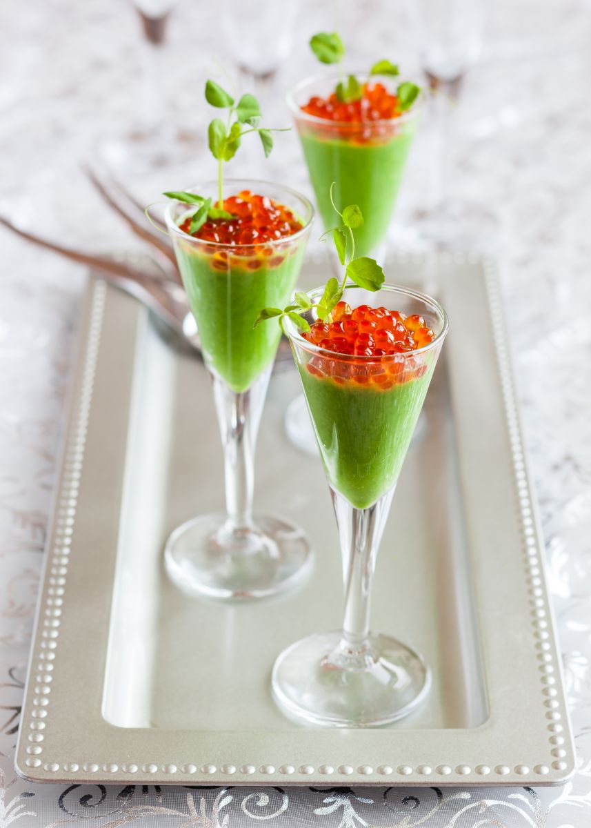 ¿Qué tal si preparas unos aperitivos en vasos de chupitos como los de la imagen de arriba? Se preparan con una crema de guisantes con aguacate acompañados de caviar de salmón.