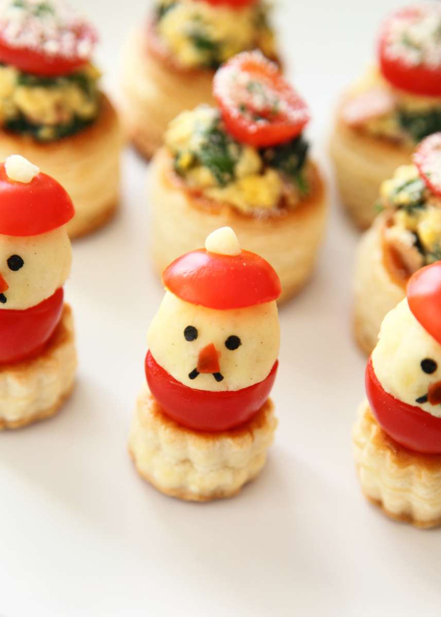 Mira qué divertidos estos canapés de Papá Noel. Para hacerlos, sobre un volován de hojaldre (que puedes rellenar por ejemplo de alguna crema de queso o paté, coloca medio tomate cherry. Encima pon una bola de puré de patata espeso, y la otra mitad de tomate cherry. Con trocitos de aceituna puedes hacer los ojos y boca y la nariz con un trocito de pimiento rojo.