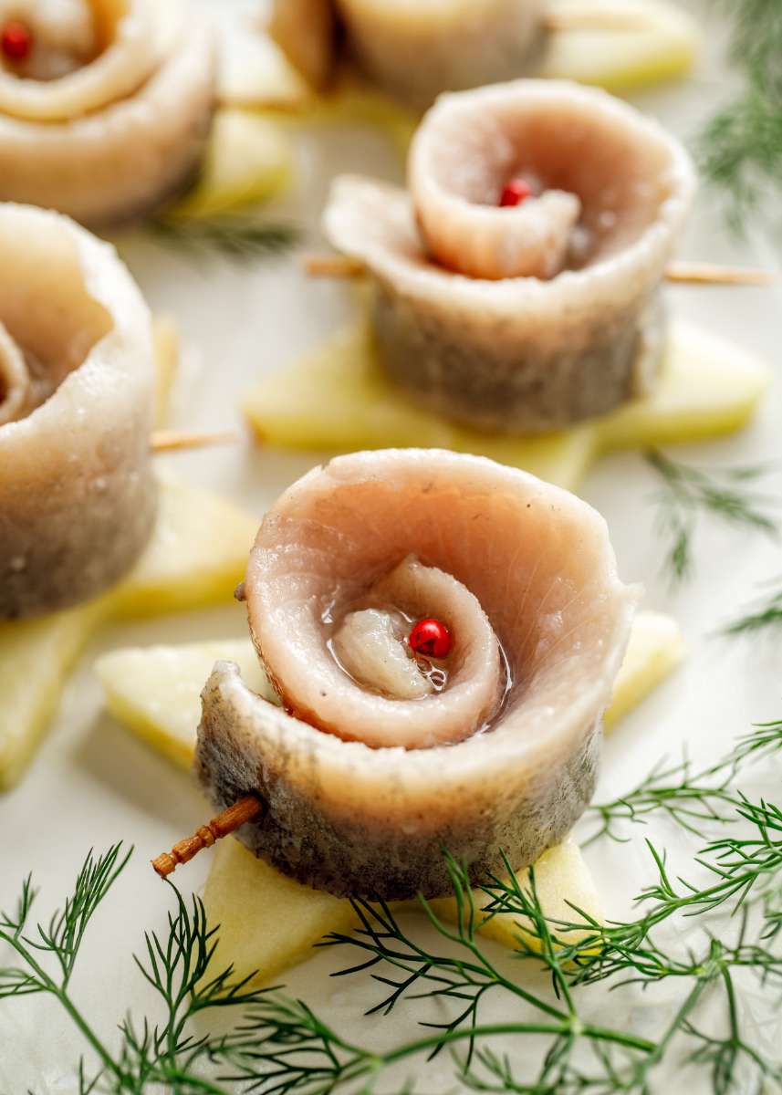 Estos canapés navideños son muy fáciles de hacer y quedan así de originales. Para hacerlos corta el queso con un cortapastas en forma de estrella. Luego enrolla un trozo de arenque ahumado y sujétalo con un palillo. Decora con pimienta rosa.