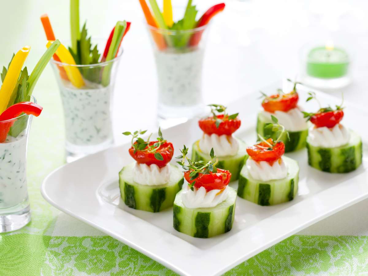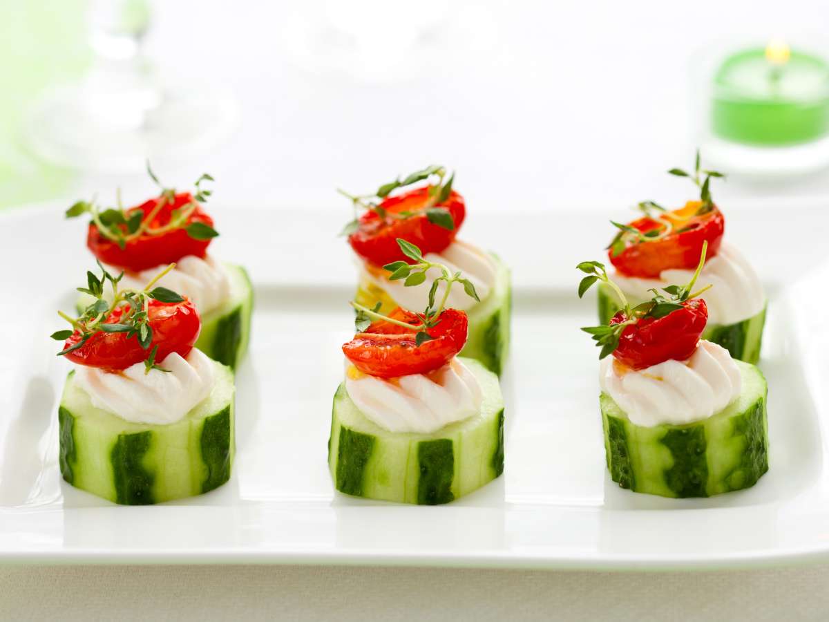 Otra idea ligera y deliciosa es cortar rodajas de pepino, poner encima un poco de queso crema con una manga pastelera y medio tomate cherry aliñado con aceite, vinagre y sal. Decora con orégano fresco o con otras hierbas aromáticas.