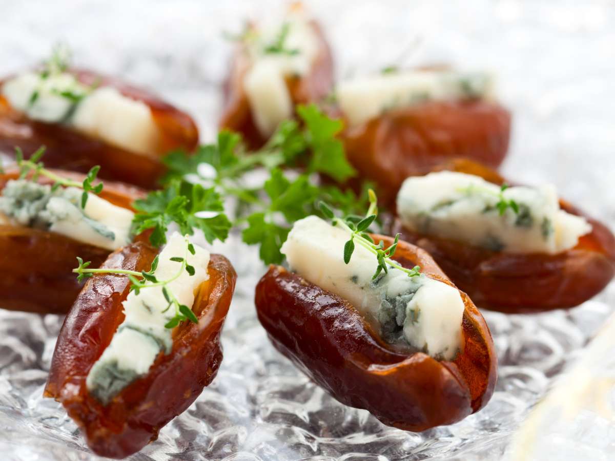 Estos canapés son muy sencillos de hacer, solo tienes que cortar unos dátiles de forma longitudinal, quitarles el hueso si lo tiene y poner un poco de queso azul, que creará un delicioso contrate.