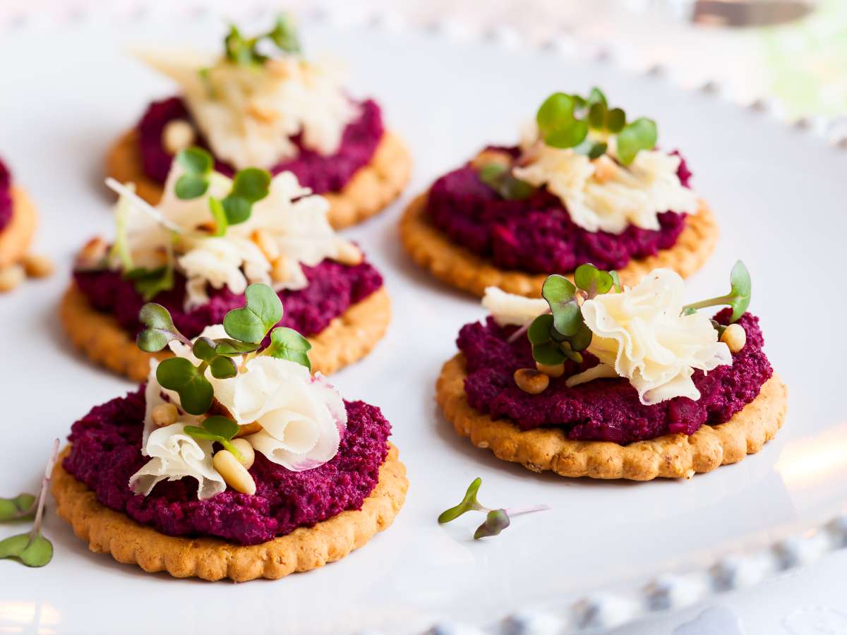 Los crakers o galletas saladas son una opción fantástica para hacer canapés navideños. En la imagen de arriba puedes ver una opción fácil con hummus de remolacha, acompañado de unas lascas de queso y piñones.