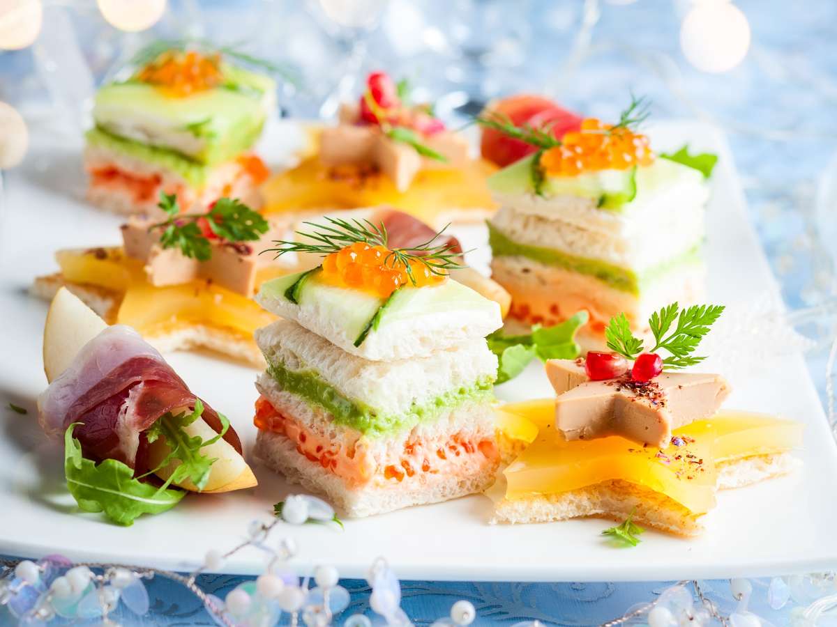 Ingredientes: pan de molde sin corteza; lechuga; queso emmental o similar; uvas moradas sin pepitas; aceitunas negras sin hueso; alcaparras; tomate cherry; salmón ahumado; jamón de york; boquerones en vinagre.