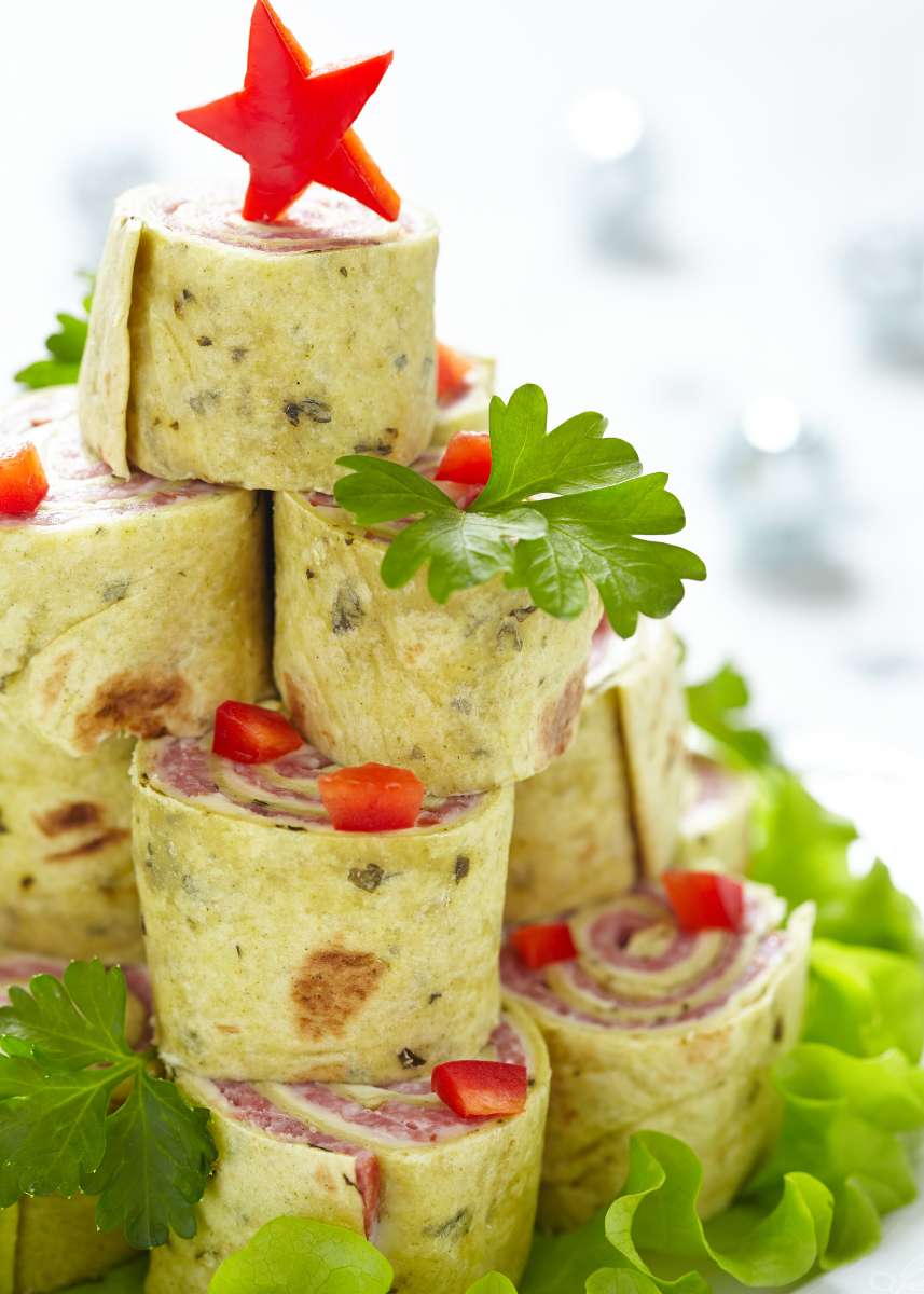 Esta opción para los niños es muy divertida. Debes coger tortillas de maíz, cubrirlas con jamón York y queso y cortarlas en trozos. Luego pon en forma de árbol de Navidad y decora con trocitos de pimiento rojo, coronando con una estrella.