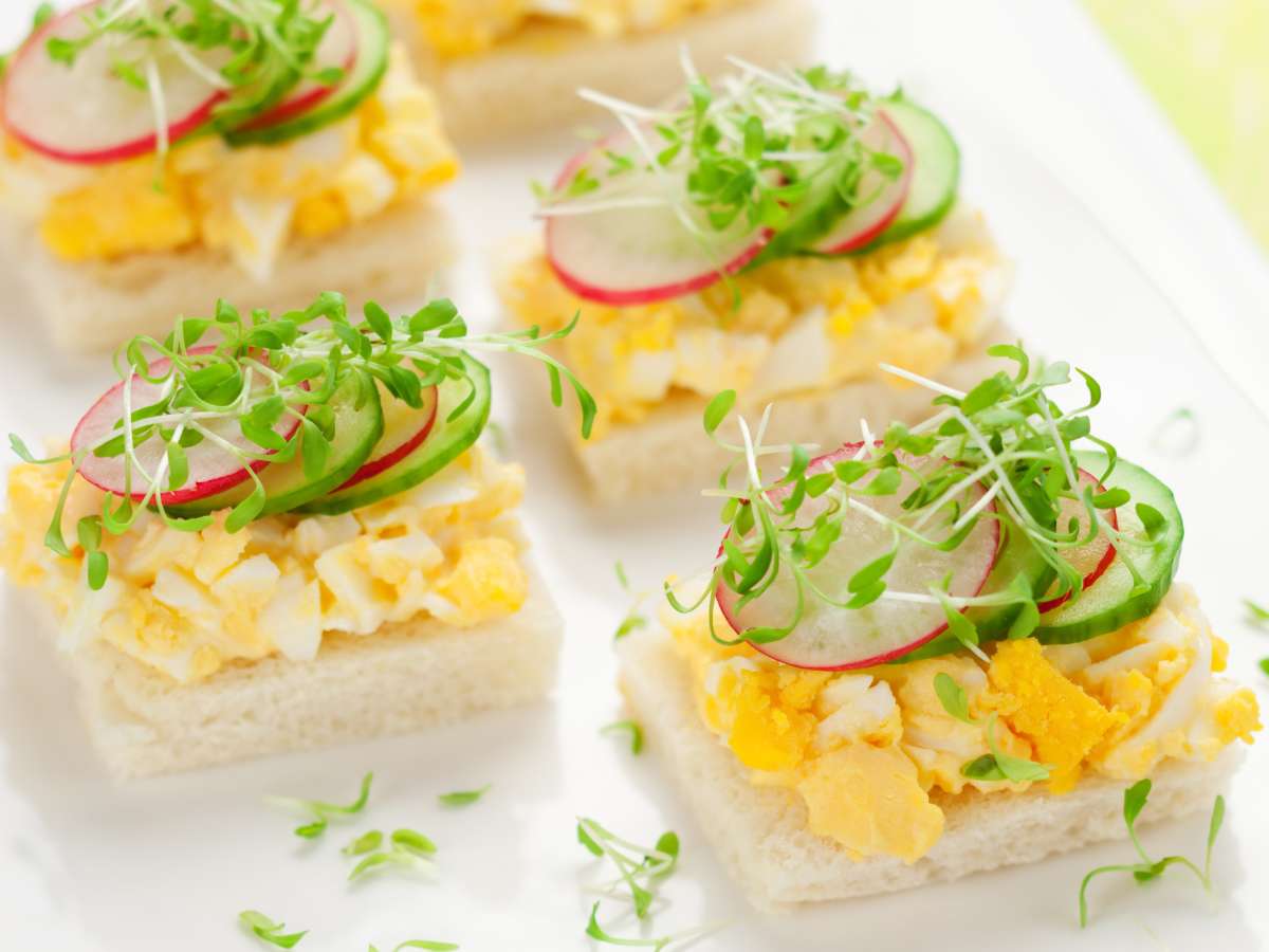 Estos canapés de pan de molde son muy sencillos de preparar. Para hacerlos pica huevo cocido y colócalo sobre el pan de molde. Encima coloca rodajas de rábano y de pepino. Pon encima hierbas frescas como orégano.