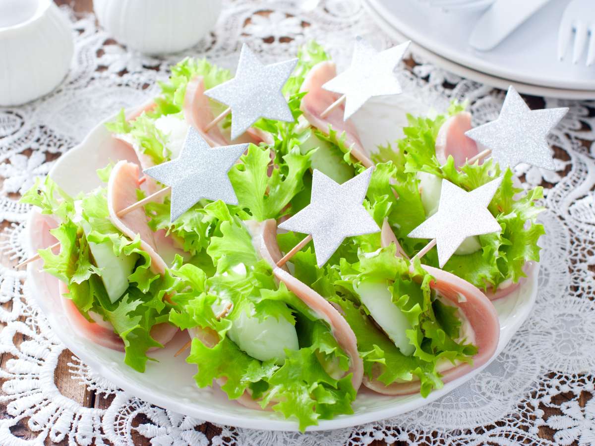 Comer bien y ligero en Navidad no está reñido. Si quieres un bocado ligero para tus aperitivos coge lonchas de jamón York, pon encima lechuga y queso mozzarella, dobla por la mitad y asegura con un palillo.