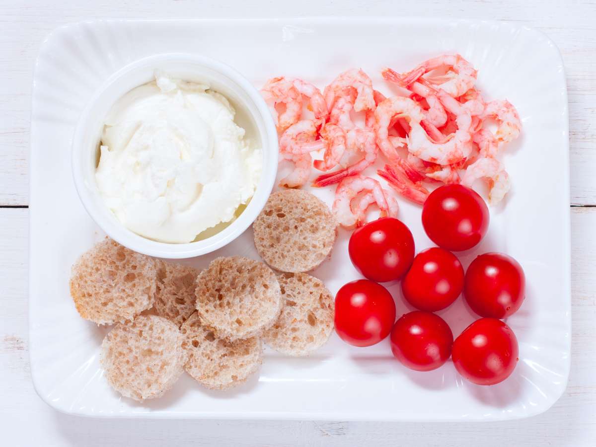 Ingredientes: Pan de molde; tomates cherry cortados por la mitad; queso crema; gambas cocidas y peladas; eneldo fresco; sal; pimienta.