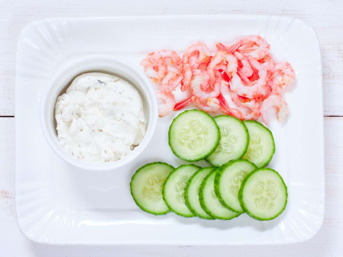 Ingredientes: Pan de molde o galletas saladas redondas; pepinos cortados en rodajas de 1 cm de grosor; queso crema; gambas cocidas y peladas; eneldo fresco; sal; pimienta.