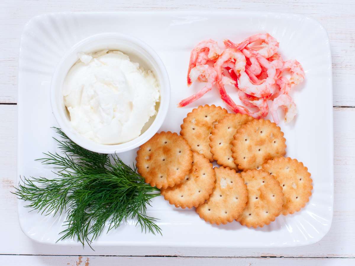 Otra opción es utilizar las galletitas saladas con queso crema, eneldo fresco y gambas cocidas.