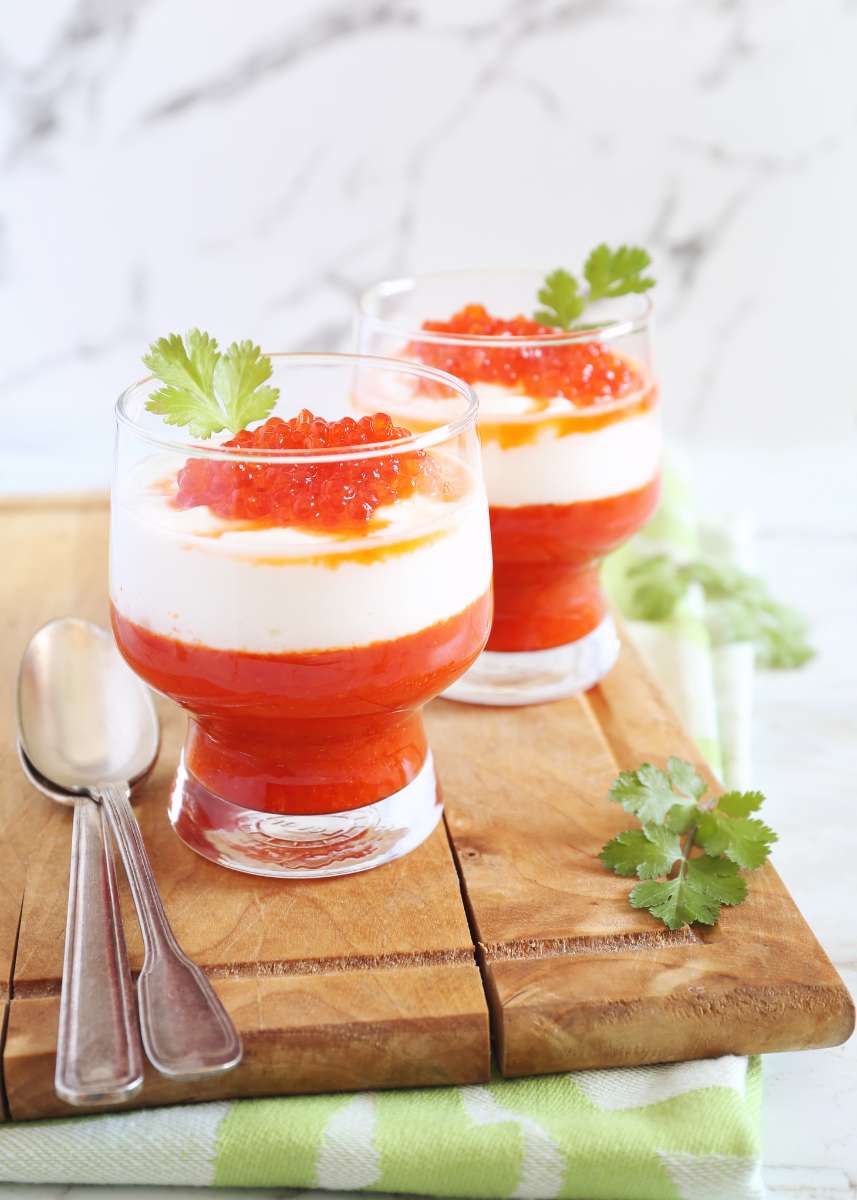 Ingredientes: Pimientos rojos asados; queso crema; nata líquida para montar; gelatina sin sabor; caviar de salmón; aceite de oliva; sal; pimienta; hojas de cilantro para decorar.