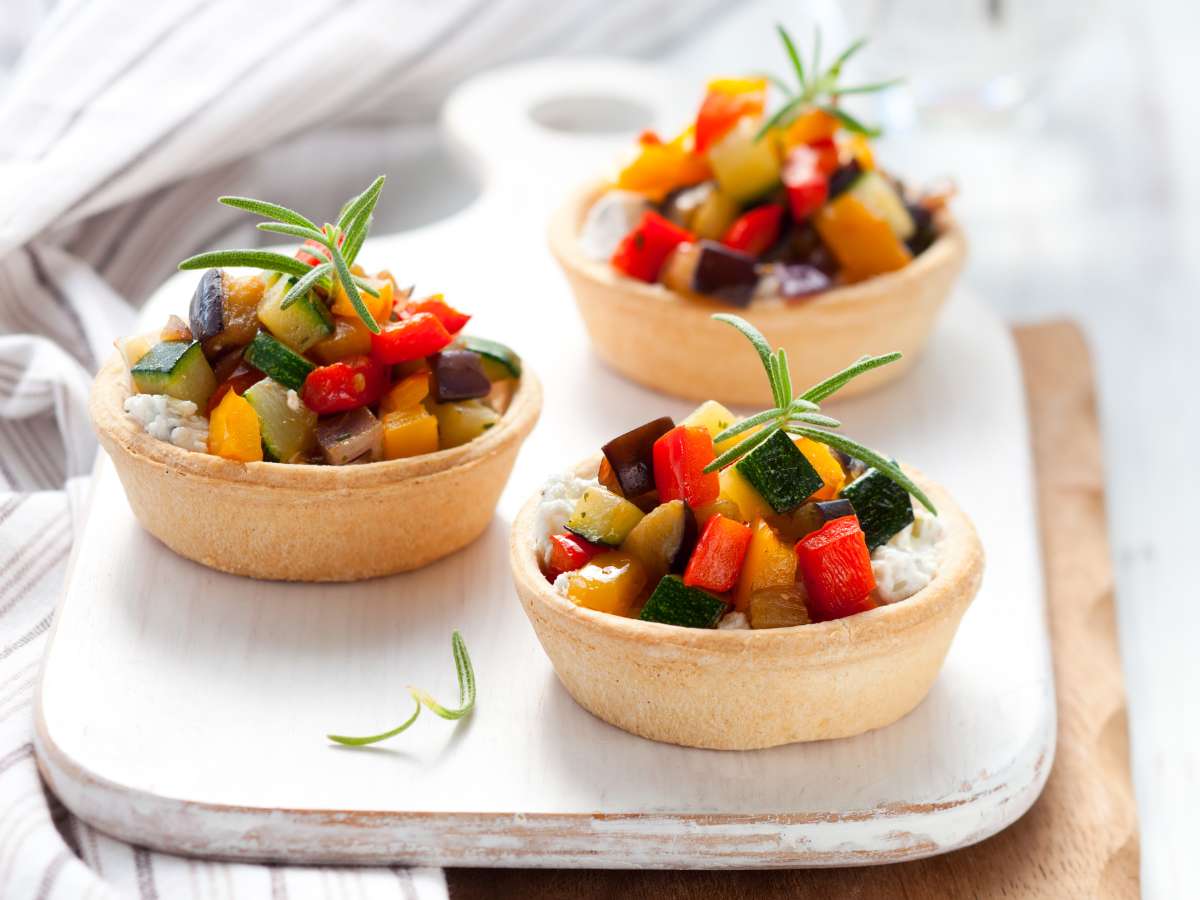 Prepara un salteado de verduras variadas de ru gusto (pimiento, calabacín, berenjena…) y colócalo sobre una base de queso crema en las tartaletas. Será un entrante de lo más suculento y fácil de preparar.