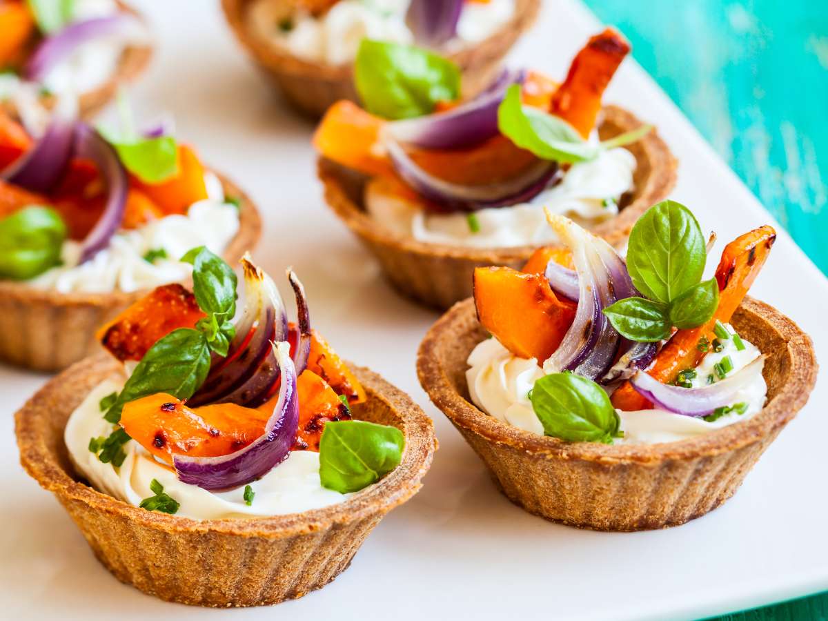 Estas tartaletas llevan una base de calabaza al horno y cebolla sobre una base de queso crema, otra combinación ganadora con las verduras como protagonistas.