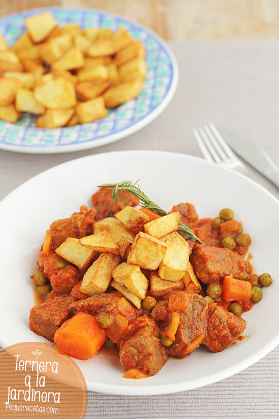 La ternera a la jardinera no necesita presentación, un guiso tradicional por donde se lo mire. Un estofado de ternera cocinado junto con cebolla, tomate, zanahoria y guisantes al que le incorporamos al final unos dados de patatas fritas, perfecto para toda la familia.