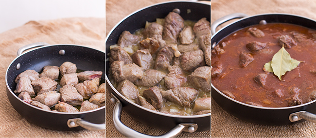 Vertemos el aceite en una cacerola amplia. Cuando el aceite comienza a estar caliente, añadimos los trozos de carne de ternera y rehogamos durante 10 minutos.