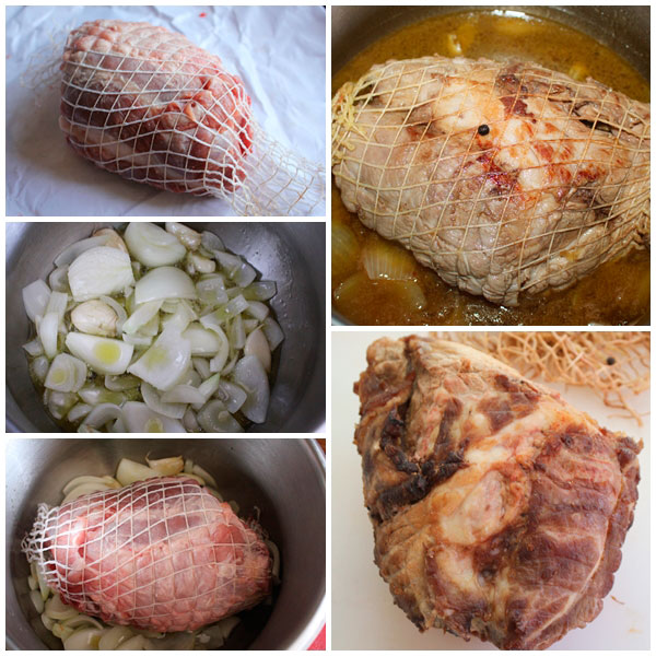 Normalmente se rehogan las cebollas y ajos en la manteca, pero ella ha preferido hacerlo con aceite de oliva. Yo Le añado una zanahoria y un clavo de olor y luego trituro la salsa. La carne es de cabezada de lomo de cerdo.