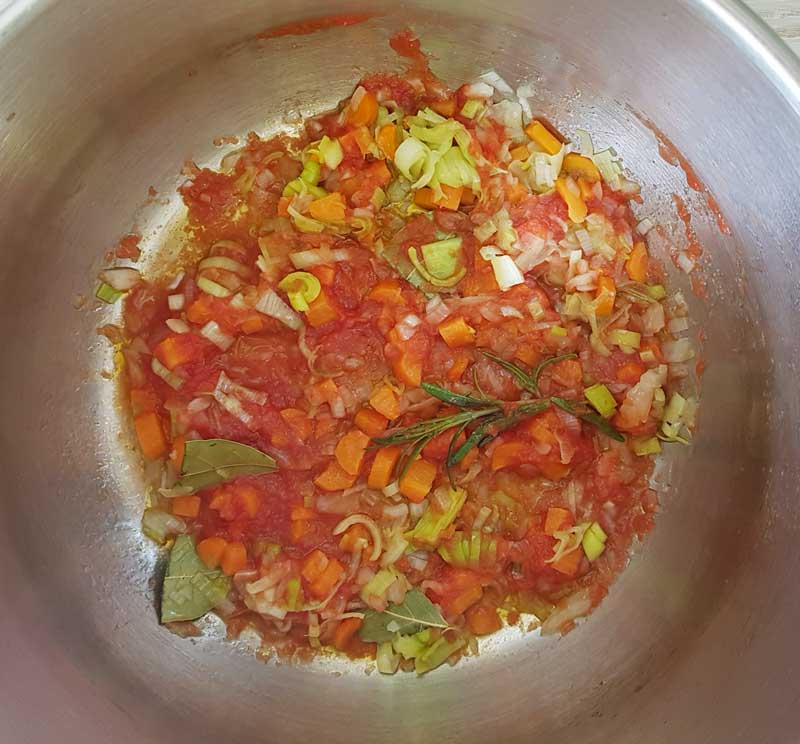 - Pochamos las verduras 10 minutos junto a las hierbas aromáticas y las hojas de laurel.