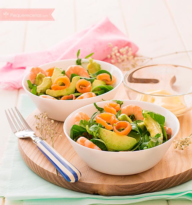 Preparación: Pelamos los aguacates, los cortamos en rodajas y los rociamos con jugo de limón; cocemos los langostinos en agua hasta que cambien de color, los escurrimos y los enfriamos con agua fría, luego procedemos a pelarlos. Cortamos el salmón en tiras. En un recipiente, disponemos el aguacate, las hojas de rúcula y canónigos, los langostinos y el salmón ahumado. Acompañamos con mayonesa y podemos añadir un poco de sal al gusto.
