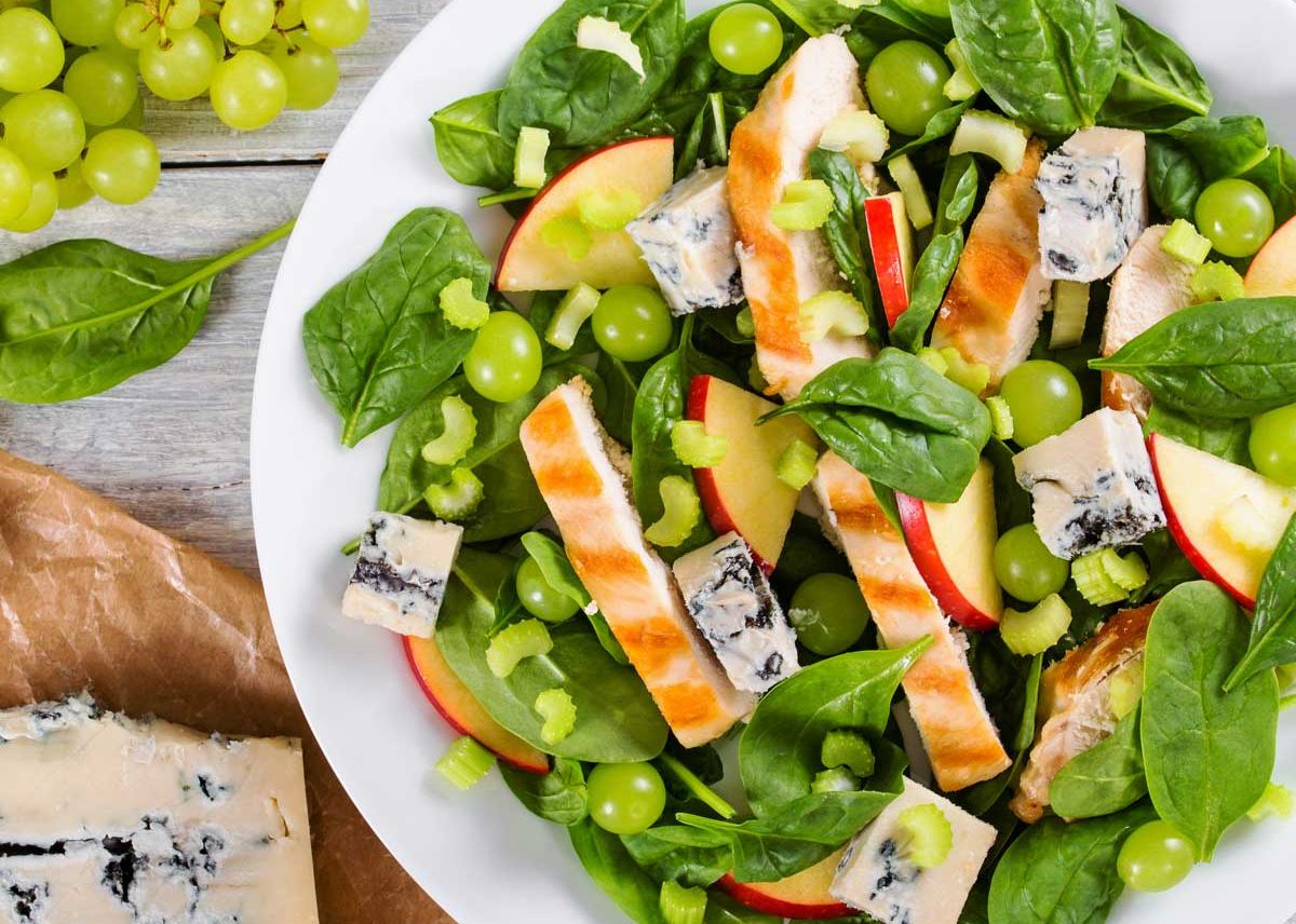 Ingredientes: 2 pechugas de pollo sazonadas con sal y pimienta al gusto; 150 g de queso azul desmenuzado; 2 tallos de apio cortados en rodajas finas; 1 manzana cortada en láminas finas; 1 taza de uvas cortadas por la mitad y sin semillas; 4 tazas de espinacas frescas.