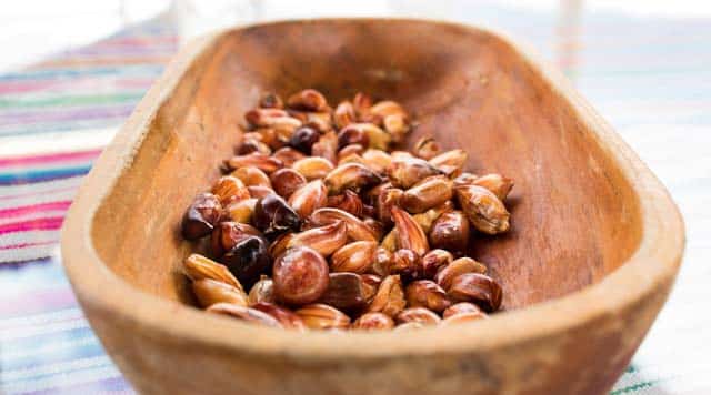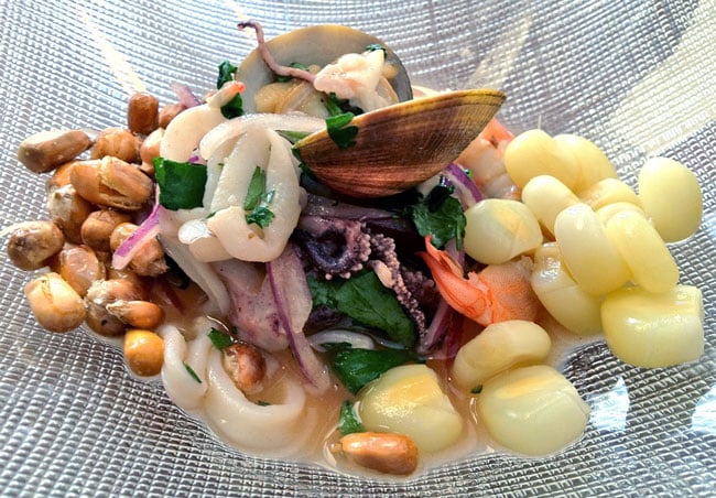 Ingredientes: 1/2 kg de corvina, mero u otro pescado blanco en cubos pequeños; 300 g de calamares; 28 a 30 almejas; 4 a 5 limas exprimidas; 1 diente de ajo picado; 1 cebolla roja mediana en juliana; 2 a 3 chiles serrano despepitados y en rodajas finas; 1/4 taza de aceite de oliva extra virgen; 1 cucharada de cilantro picado; maíz choclo y cancha o maíz frito