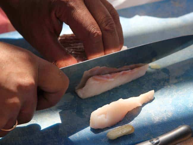 Lo ideal es cortarlo en cubos de entre 1 y 2 cm, quitándole previamente la zona de espinas. La diferencia entre el ceviche y el tiradito es que este último se corta en tiras.