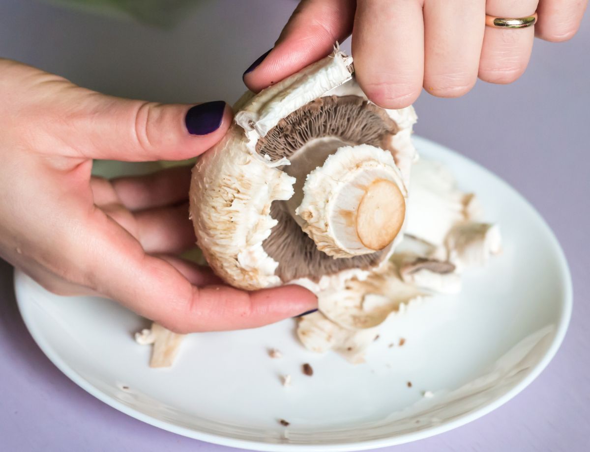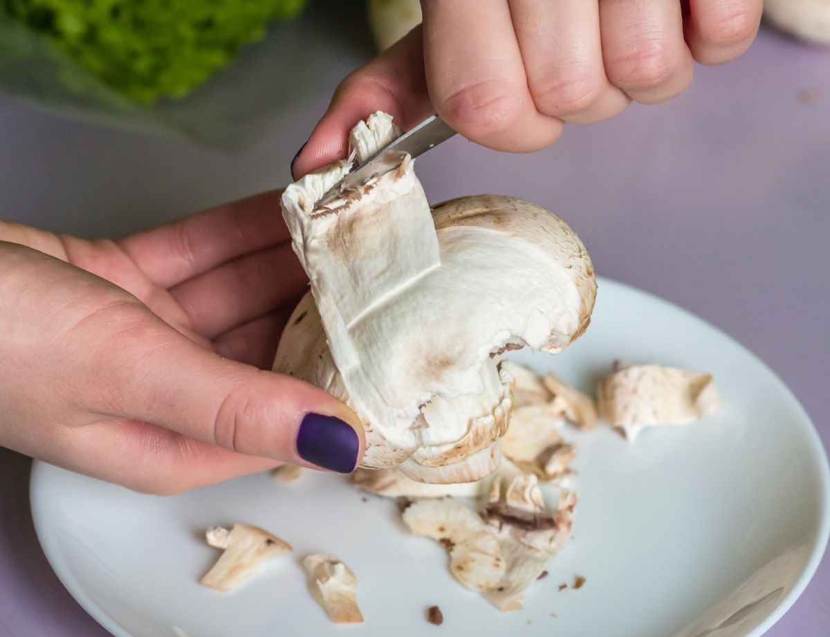 - Con un cuchillo afilado, coge la parte bajo el sombrero del champiñón, tirando de él. Verás que la piel se desprende con facilidad.