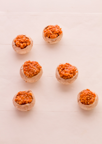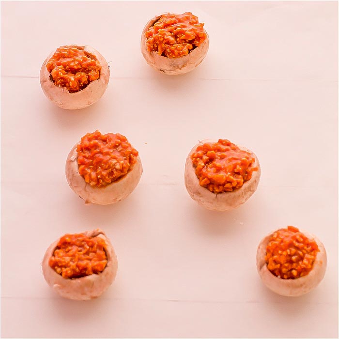 - Una vez tengamos la salsa boloñesa preparada, con un cepillo limpiamos los champiñones, retiramos el rabito y rellenamos con nuestra salsa boloñesa.
