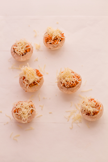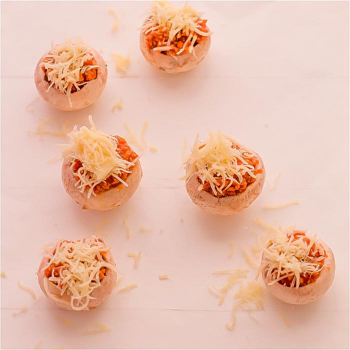 - Los dejamos sobre la bandeja de hornear, que tendremos ya preparada con papel de horno, y espolvoreamos sobre cada champiñón relleno un poco de queso rallado.