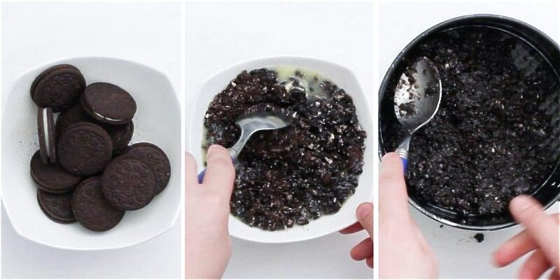 - Hacer la base: Tritura las galletas Oreo y mézclalas con la mantequilla derretida hasta obtener una pasta homogénea.