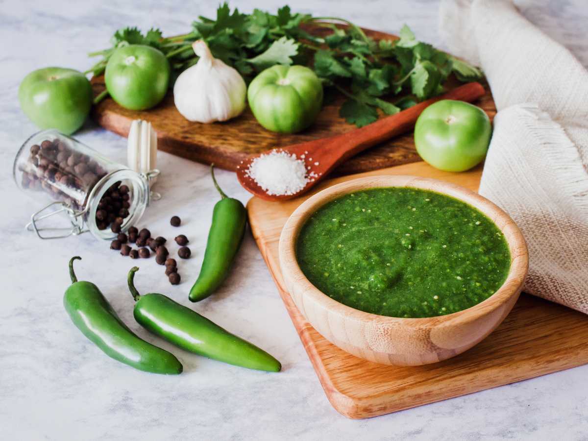 - Comenzamos preparando la salsa verde. En una olla, hierve los tomates verdes y los chiles serranos hasta que estén tiernos. Luego, colócalos en la licuadora junto con la cebolla, los dientes de ajo y el cilantro. Mezcla hasta obtener una salsa suave y sazona con sal al gusto.
