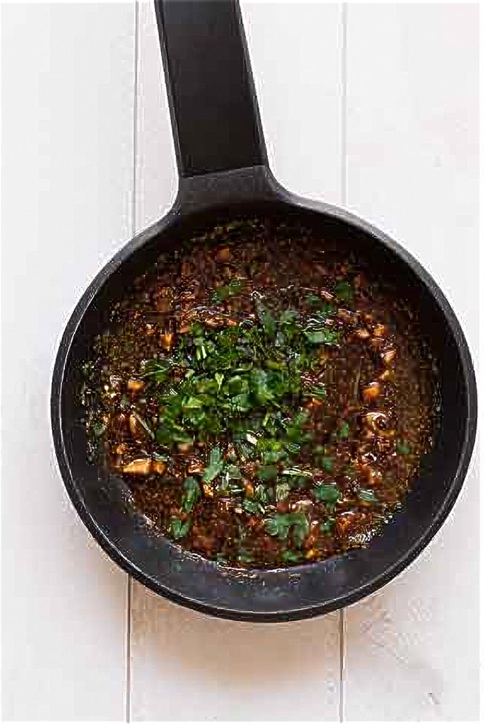 - Una vez el aceite esté templado añadimos el perejil bien picado, ajos picados, pimentón dulce, vinagre y sal.