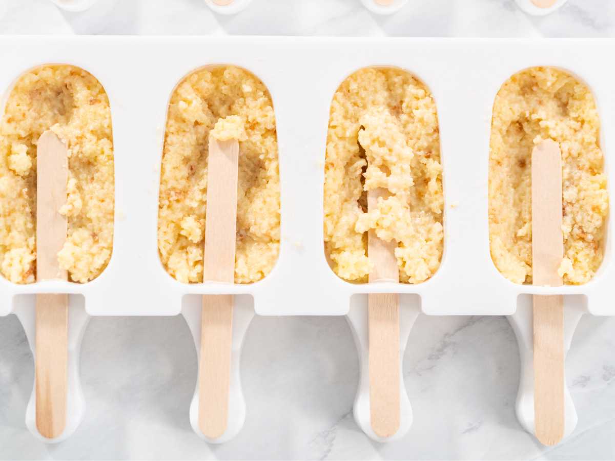 Insertamos un palito de helado en el centro de cada uno y alisamos la superficie con una cuchara. Metemos el molde en el congelador durante unos 20 minutos para que cojan firmeza y sea más fácil desmoldarlos después.