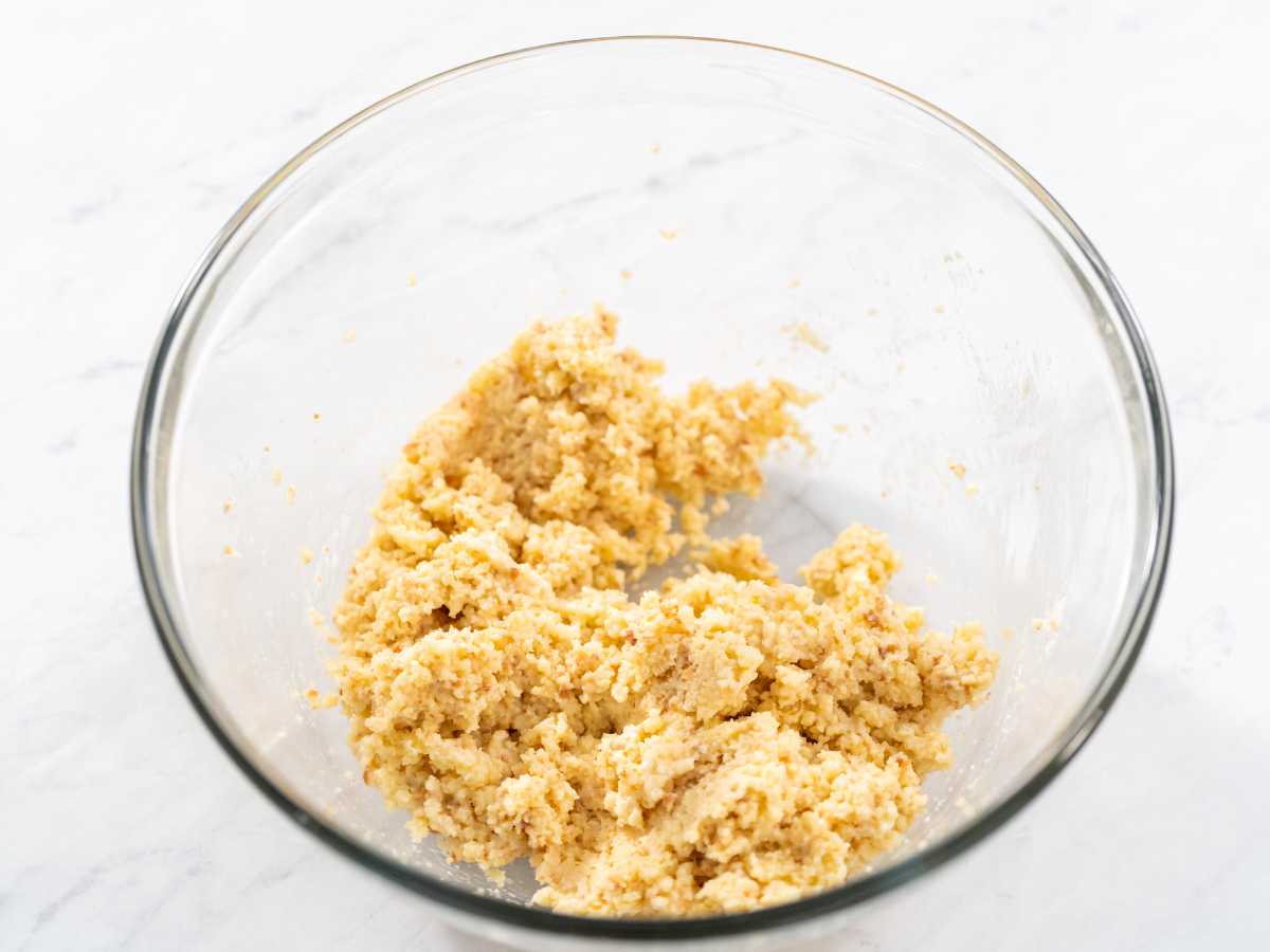 Desmenuzamos 250 g de bizcocho con las manos hasta que tenga textura de migas finas. Añadimos 2 cucharadas de queso crema y mezclamos con una cuchara o con las manos hasta que la masa quede compacta y moldeable, parecida a la plastilina.
