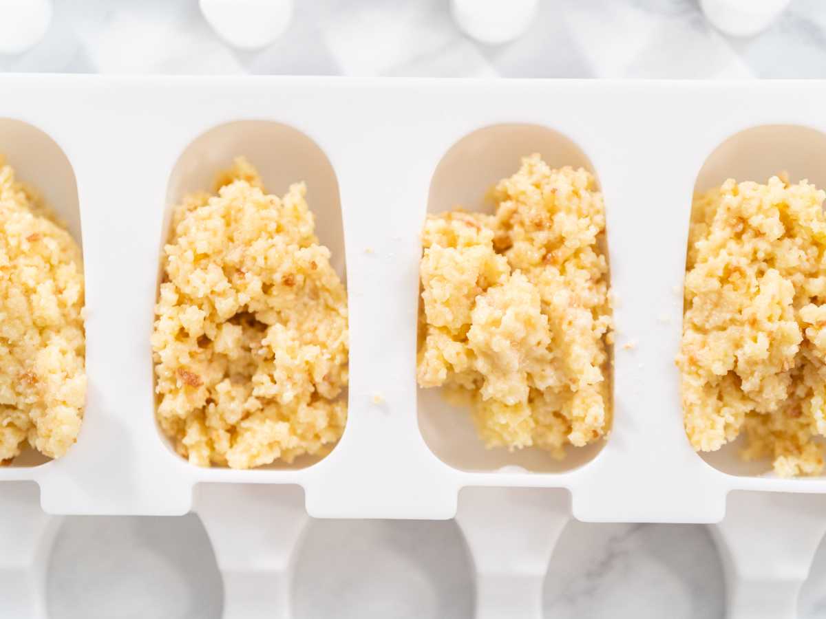 Tomamos pequeñas porciones de la mezcla y las presionamos dentro de cada cavidad del molde, procurando que queden bien compactas y sin huecos de aire.