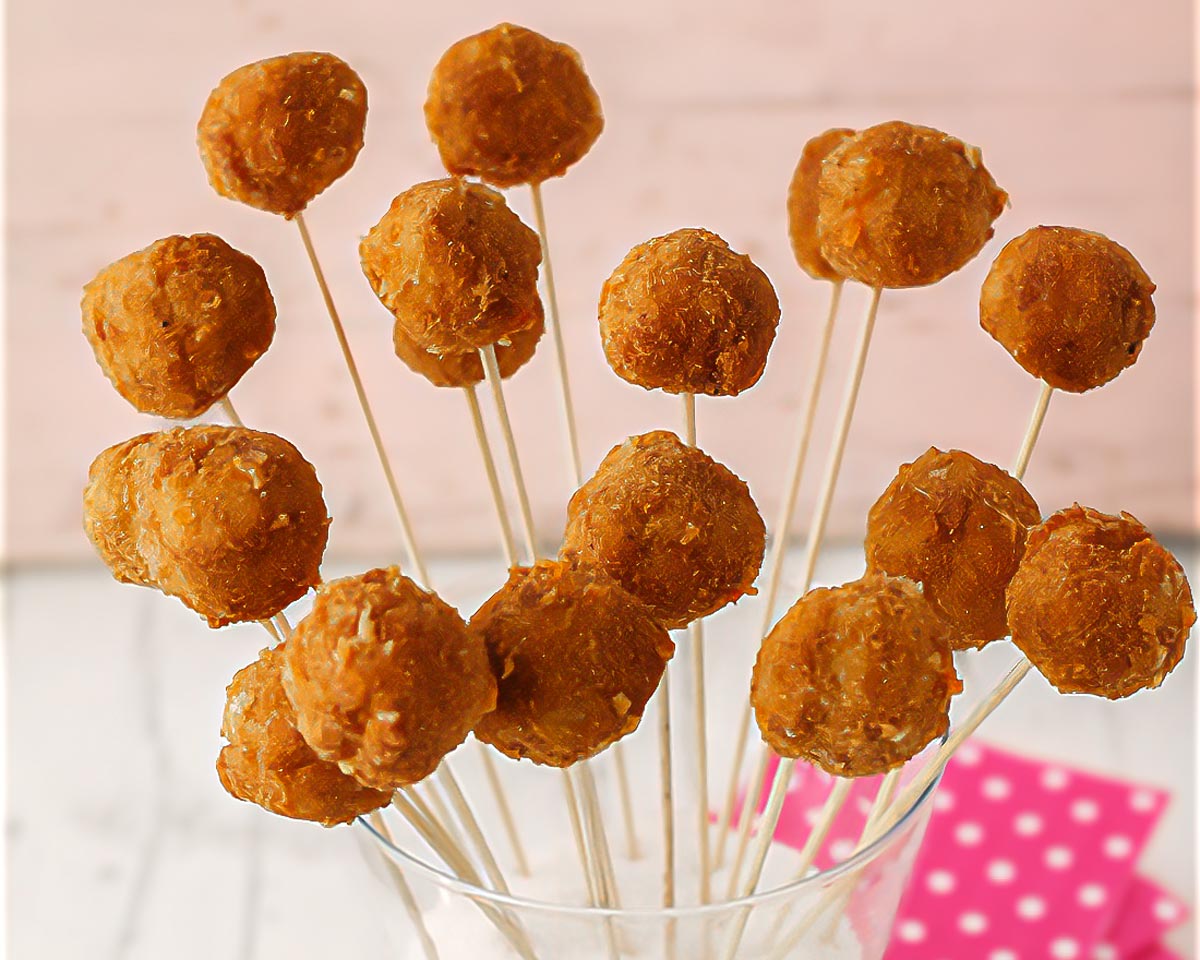 Pinchamos cada bolita en una brocheta y servimos. Para que se mantengan de pie los chupa chups de pollo podemos llenar el recipiente de sal, y luego meter las brochetas.