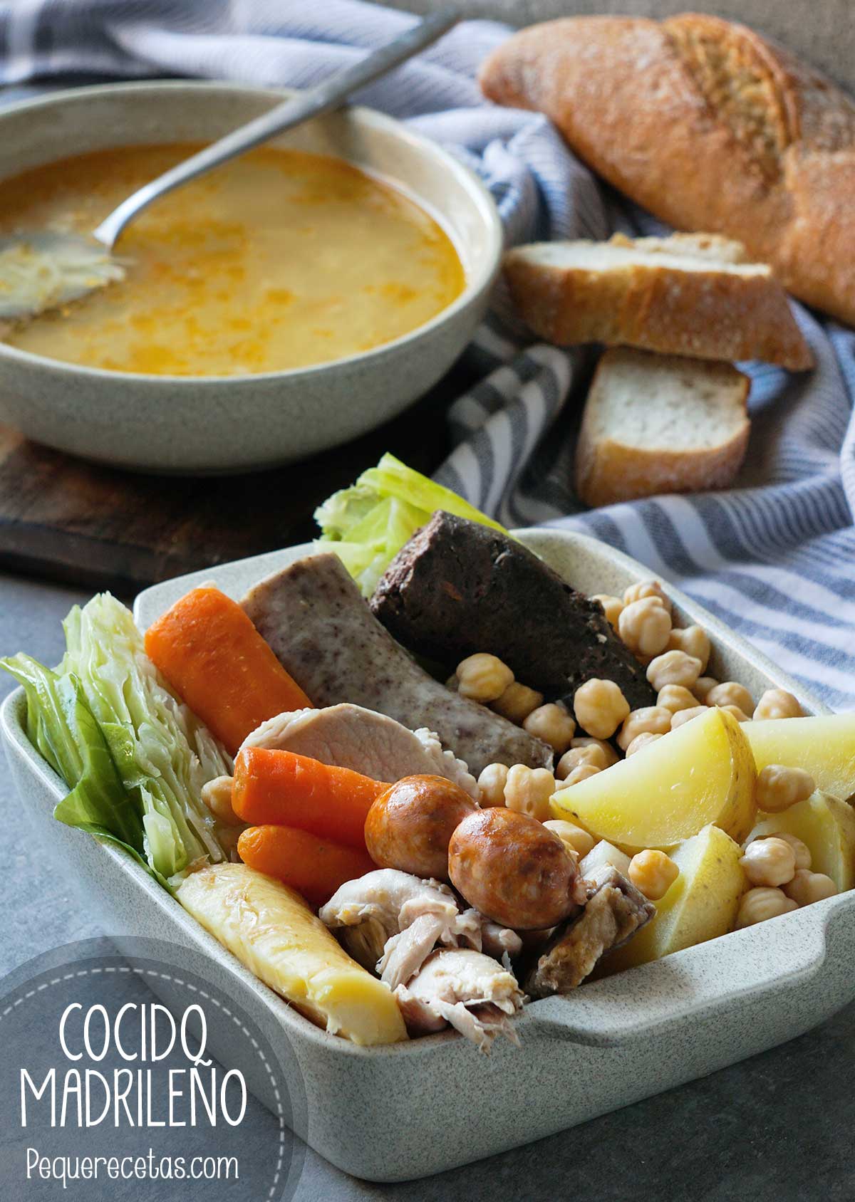 El cocido madrileño supongo que tiene tantas versiones como casas en la que se prepara, pero sin duda tiene algo especial… ¡siempre está bueno! Os traemos una versión clásica del cocido madrileño, pero como en Pequerecetas siempre primamos las recetas fáciles y rápidas de preparar, os sugerimos que probéis a prepararlo en olla express, ya que su elaboración pasa de 3 ó 4 horas a tan solo media hora, por eso tras la receta tradicional os explicamos cómo preparar el cocido madrileño en olla express (y algún truquillo para ahorrar tiempo).