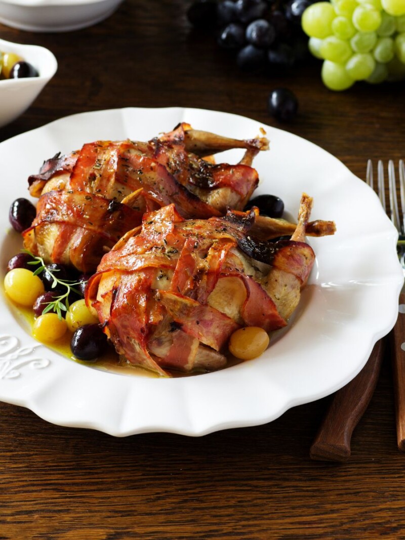 ¡Listo! Estas codornices al horno envueltas en bacon, glaseadas con miel y vinagre, y acompañadas de uvas, serán un éxito en tu mesa.