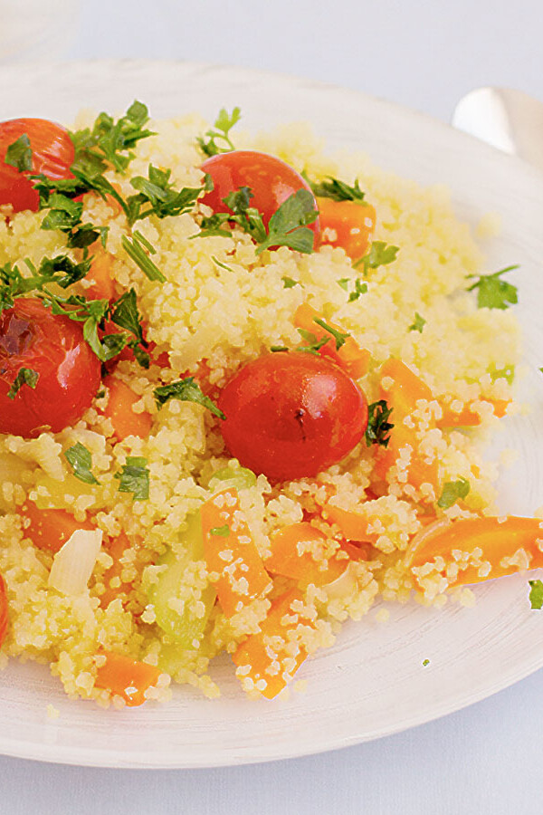 Calentamos el caldo de verduras en una cazuela. Antes de que rompa a hervir, retiramos la cazuela del fuego e incorporamos el cuscús. Tapamos y dejamos hidratar unos 5 minutos, añadimos una cucharada de aceite y mezclamos bien para que el cuscús quede suelto.