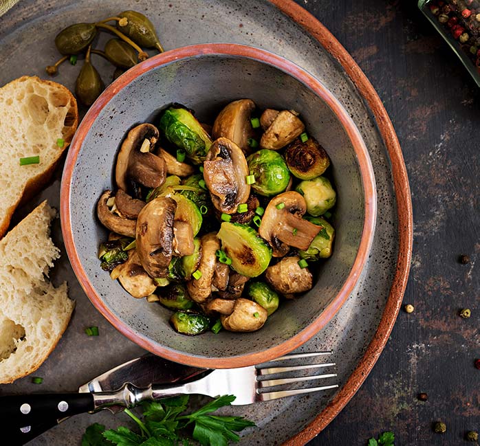 Ingredientes; 500 g de champiñones laminados; 500 g de coles de Bruselas; 8 dientes de ajo; 150 ml de vino blanco; aceite de oliva virgen extra; sal y pimienta