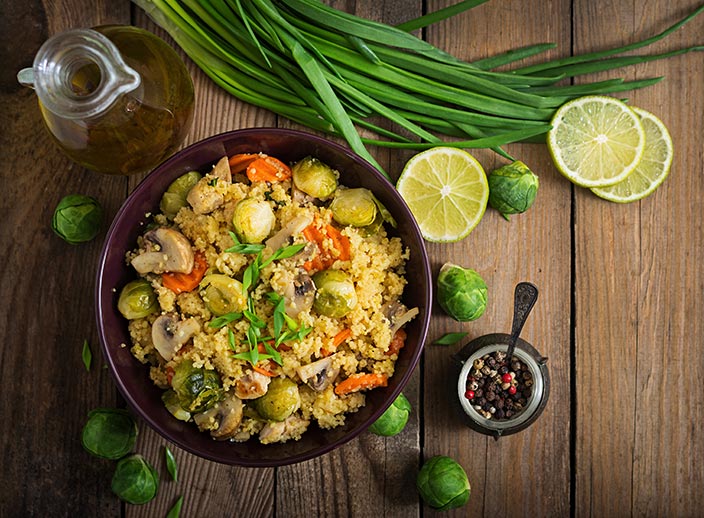 Ingredientes: 250 g de cuscús; 250 g de caldo de verduras; 1 zanahoria grande; 1 cebolla pequeña; 1 diente de ajo; 200 g de champiñones fileteados; 250 g de coles de bruselas; 1/2 pechuga de pollo; sal; pimienta en grano; aceite de oliva virgen extra.