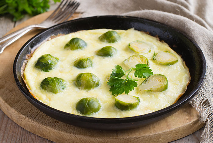 Ingredientes: 500 g de repollos de bruselas cocidos como hemos visto antes; 8 huevos; leche; sal y pimienta; aceite de oliva virgen extra.