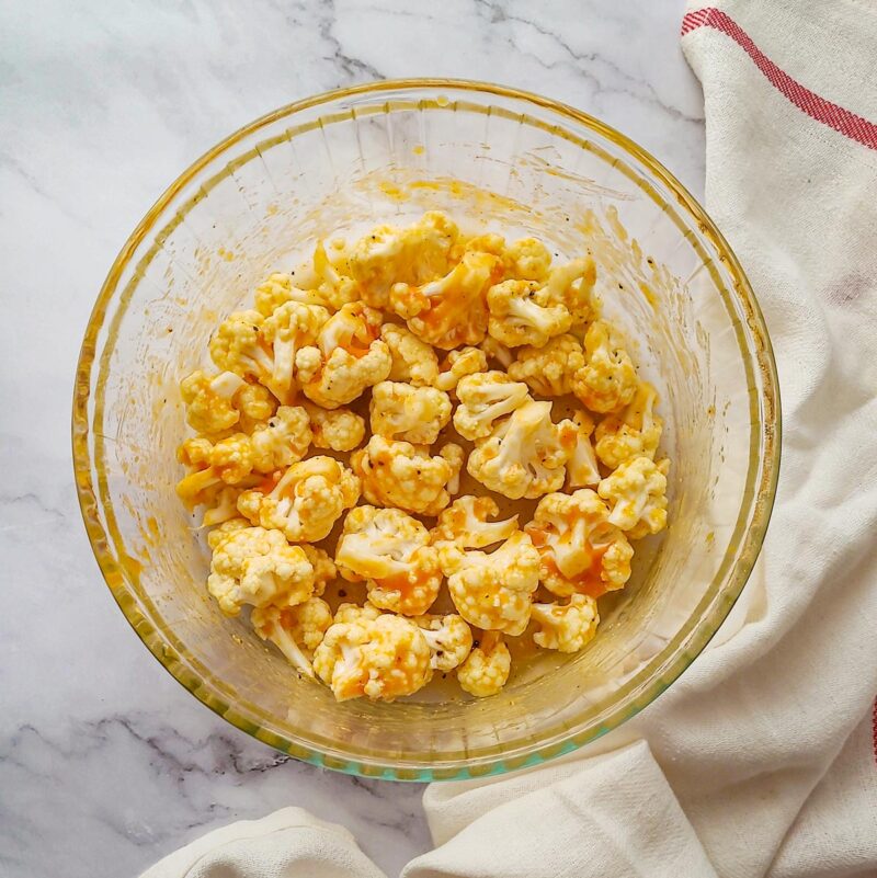 - Añade los floretes de coliflor al bol con el aliño y remueve bien hasta que todos los trozos queden cubiertos de manera uniforme. Si quieres asegurarte de que el aliño se distribuya bien, puedes usar las manos para masajear los floretes y que absorban mejor los sabores.