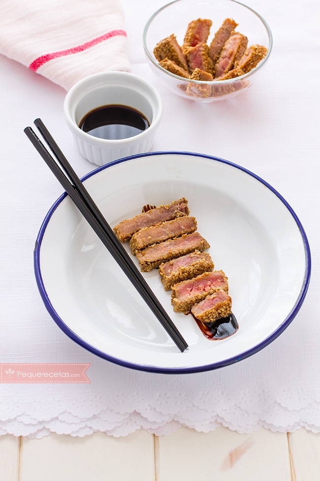 El tataki es una forma de preparar la carne o el pescado en la cocina japonesa. Tataki significa “apilado” o “distribuido en piezas”: la carne se cocina brevemente en la plancha, luego se marina con una salsa de vinagre, salsa de soja y jengibre, y se filetea. Se puede preparar como hemos dicho con diferentes tipos de carnes o pescados, nosotros os proponemos la receta de tataki de atún: