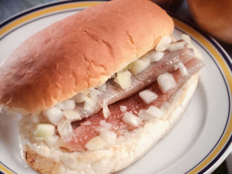 El Haring (arenque en escabeche) es un plato emblemático de la comida callejera holandesa. Puedes encontrarlo en pequeños puestos de pescado llamados Haringhandel, especialmente en verano, que es la temporada del arenque. Normalmente se sirve con pepinillos y cebolla picada, aunque también puedes optar por una versión con anguila ahumada. Si quieres vivir una experiencia auténtica en Ámsterdam, no puedes dejar de probar un bocadillo de Haring.