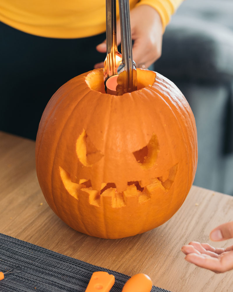 Antes de empezar la decoración de la calabaza debemos decidir si vamos a utiliza una vela o luces eléctricas para iluminarla.