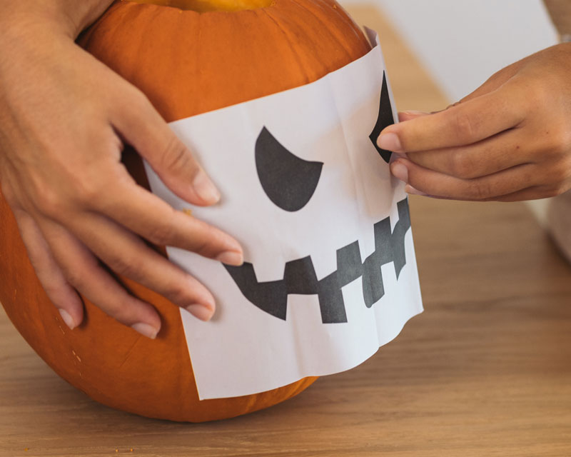 Luego, transferimos el diseño a la calabaza. Para eso, apoyamos sobre ella la plantilla de Halloween o vuestro propio dibujo.